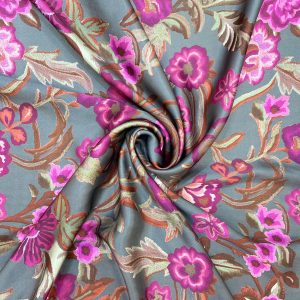 Pembe tonlarda çiçek desenli İpek Emprime Saten kumaş, hafif, akıcı ve parlak dokusuyla elbise, bluz ve özel tasarımlar için zarif bir seçimdir.