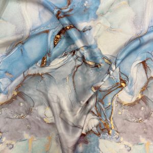 Mavi Geometrik Desen İpek Emprime Saten kumaş, modern ve zarif görünümüyle elbise, bluz ve eşarp tasarımlarına şıklık katar. Hafif, parlak ve akıcı dokuda.
